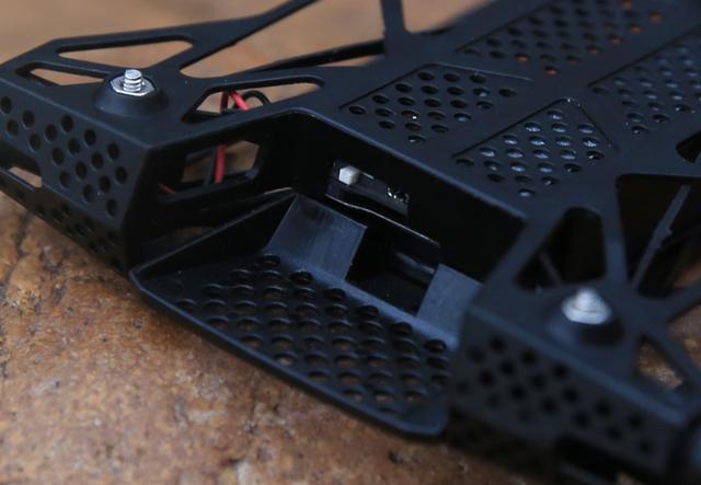 电源开关位于无人机的尾部,为一颗白色的小开关,开关上方为TF卡插槽,用来储存拍摄的相片及视频。