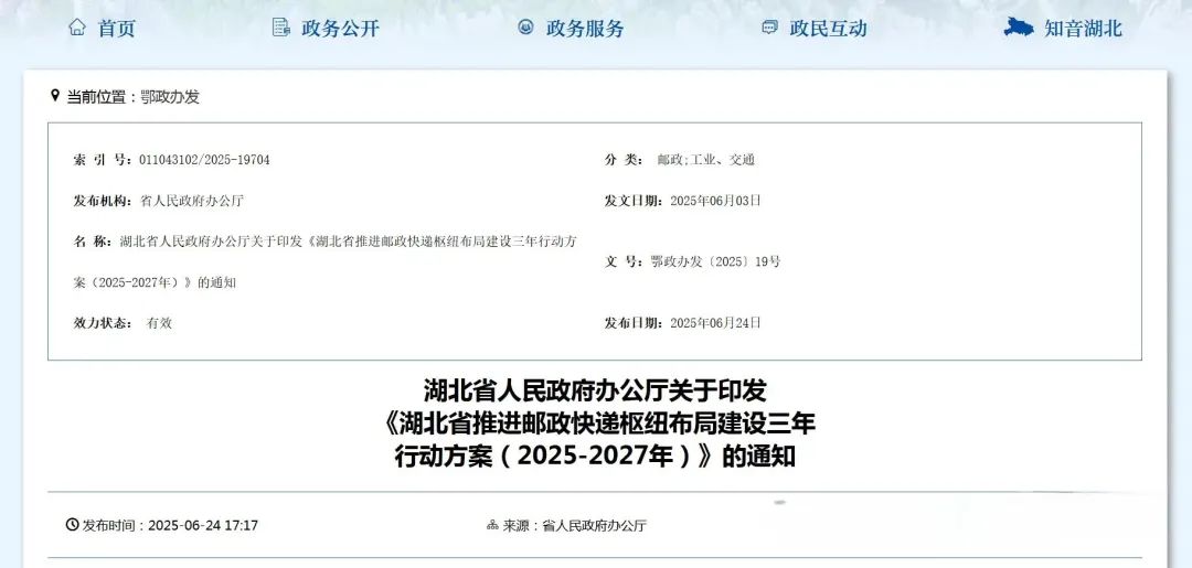 湖北省政府办公厅近日印发《湖北省推进邮政快递枢纽布局建设三年行动方案(2025-2027年)》(以下简称《方案》),明确了全省邮政快递枢纽建设工作目标,到2027年,培育3-5家年业务收入超过10亿元的快递企业,年寄递业务量突破80亿件,带动网络零售额5000亿元、农产品交易额800亿元、降低物流成本55亿元。