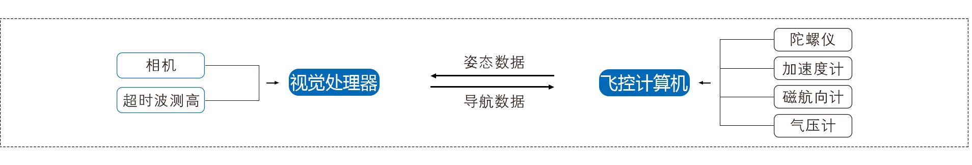 视觉处理平台通过多旋翼无人机底部或前部的双目摄像头实时拍摄图像信息,图像处理板接收到图像信息后进行算法解算,并和飞控计算机的姿态和位置数据进行融合滤波,最后给出无人机的姿态、位置及障碍物信息,以实现精确导航或 视觉壁障。
